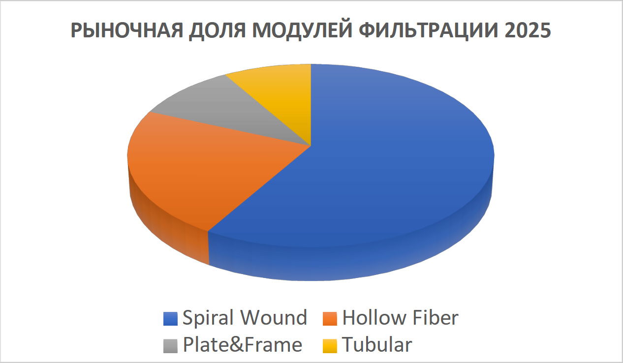 Спирально-навитые мембраны являются стандартом в системах опреснения и деминерализации воды, на их долю приходится более половины мирового производства мембран [источник: https://www.usdanalytics.com/industry-reports/membrane-filtration-modules-market].